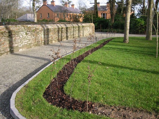 A newly-planted hornbeam hedge in West Cork. The base is well protected by bark mulch. This is a fast and inexpensive way to create longer hedges.