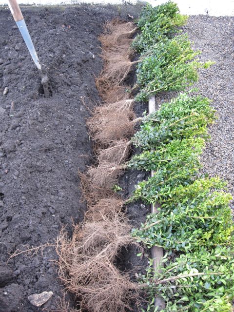 Bare-root hedges: Many plants which are traditionally used in hedges can be planted bare root. Whether a native hedge of mixed species of a more formal hedge of one species, you just need to calculate the correct spacing. As a general rule, choose between 3 plants per metre for a single row or 6 plants per metre for a double (staggered) row. If the soil is already cultivated, a trench can be dug, the plants laid out and then filled in carefully around them, as shown below when planting a box hedge. If the soil is not cultivated, then use the T-shaped cut method. In all cases, it is very important that the plants are not allowed to dry out. They should be kept heeled in the ground or in their bags until the absolute last minute.