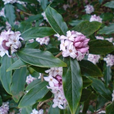 'Jaqueline Postill' produces intensely fragrant flowers which are pink on the outside and white within. Healthy and substantial specimens of this very choice winter-flowering shrub. This highly scented plant forms an upright evergreen shrub.  It will thrive in fertile, free draining soil provided it is not too dry, in sun or light shade. It makes an ideal shrub for the smaller garden because it is slow growing and flowers during the late winter when most other plants are dormant. Plant near a door or garden gate to get the most out of it. Daphnes hate transplanting and should only be pruned when absolutely necessary. Growing to a height of 2 m. 7.5 litre pot. Plants 80-90cms.