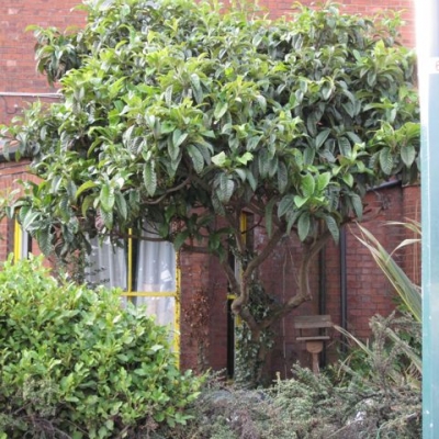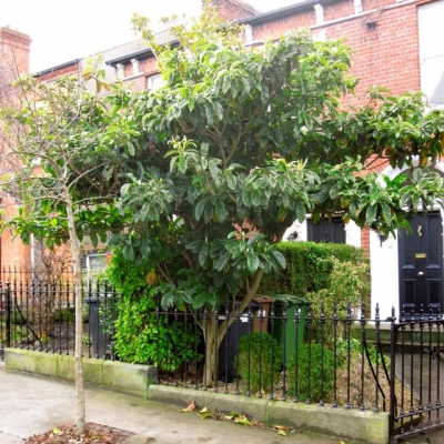 The Loquat is an unusual evergreen tree, with large evergreen leaves and a relatively compact size - much prized as an 'architectural plant'. Well suited to urban or suburban gardens where compact size, and large, evergreen leaves are desirable. If planted in a warm, sheltered spot (such as against a south facing wall), it can produce exotic scented flowers in autumn, followed by edible fruits (Loquat) in April or May. These fruits are popular throughout southern Europe and many parts of West Coast America and Asia. Best in mild areas, in a warm sheltered spot if you want fruit. Plants are 'standard' size,  approx 150-170cms tall, clear stem, in a 18L container.