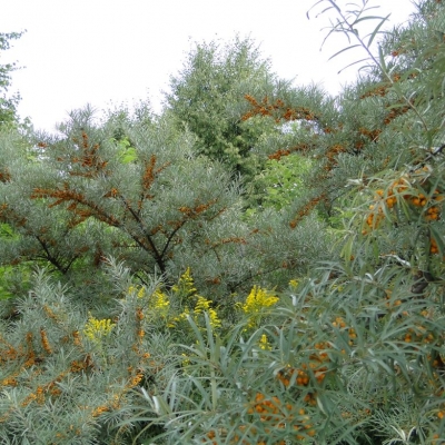 Sea buckthorn is one of the toughests plants for the seaside. An excellent plant for seaside windbreaks, and often the 'first line of defence' against difficult maritime conditions, it can grow in sandy soil, wet or dry, and withstand salty, seaside conditions. It is a 'nitrogen fixer' so it can tolerate poor soil. Its silver leaves make it an attractive, willow-llike plant, and it has thorns which mean that, if trimmed annually, it can make an effective barrier hedge. Orange berries in autumn are retained over the winter and are a valuable source of food for some bird species. There are many culinary, cosmetic and medicinal uses for this plant. Plants should be planted in small groups or as a hedge. For a hedge, space plants 50-60 cms apart and be sure not to damage the base when controlling grass whilst they establish.
