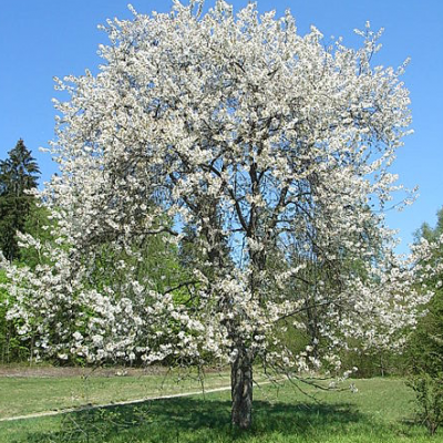This fast-growing, native cherry has white flowers in April and May and clusters of edible (though fairly sour) cherries later in the summer - very popular with the birds. This is a good plant for a woodland edge, in a hedgerow or near a stream. The thorny branches make it useful as an tough hedge or as part of a native hedgerow. This wild cherry is tolerant of limier soils than many plants, and has pretty russet coloured bark all year round, as well as reasonably good autumn colour. Plant in full sun or light shade in most soils.