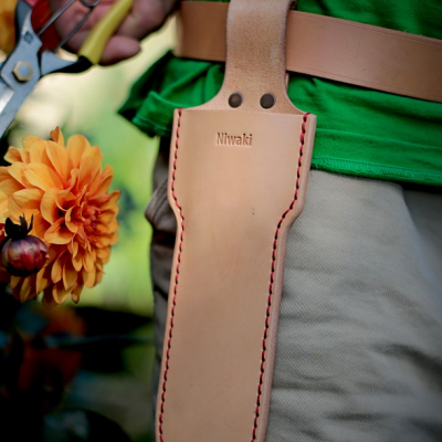 A sturdy leather holster to hold the Niwaki topiary clippers or Hori Hori knife, and to help you ensure that they don't get lost in the garden. Made from 3.5mm hand-stitched leather with copper rivets, it is both sturdy and practical. It is has a belt loop and a 21cms long pouch.