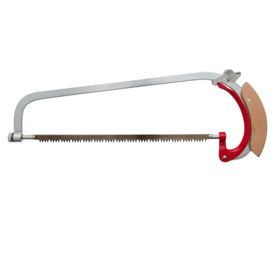 A pruning saw with a 360° replaceable and rotatable blade, beech wood handle, skip grooves and aluminium safety lever.
