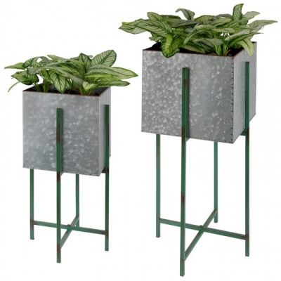 A square zinc cover pot on a metal stand. It gives height to a plant pot without the need for a seperate stand of table to place the pot on. Best used to cover a plastic pot and saucer, as it has no drainage in the bottom of the pot.