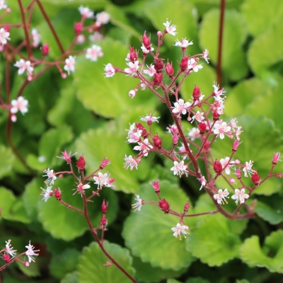 A rockery plant with rosettes of leaves and a profusion of pink-stemmed white flowers in airy bunches up to 30cm tall in late spring and summer. It is tolerant of many conditions but grows best in well-drained, but not dry soil and partial to full shade. It is a useful shade-loving groundcover and makes a great colony over a few years. A very popular plant, which is a must-have for year-round interest. Great value plant in a small 9cm pot. Plants displayed on this website may not be available in each of our shops.
