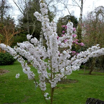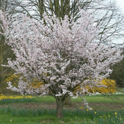 A small, upright cherry tree covered in shell-pink flowers in spring, fading to white. Rather small leaves for a cherry tree, which emerge bronze and turn bronze-red in autumn. Due to its vase-shaped upright appearance it is suitable for small-medium gardens. Eventual height 5m. Plant in most garden soils in sun or light shade and, if any pruning is necessary, do this in summer when the tree is in leaf. 6ft tall trees. Only available in our Dunboyne shop. Although generally in stock, they may be sold out at the time of your visit.