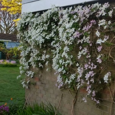This is a very large deciduous climber with larger, pure white flowers up to 7cms diameter, with bright yellow centres. It blooms from early spring into midsummer, and occasionally repeats later in the year. Only for where space permits as it can grow up to 10 metres - perfect for winding its way thjrough a tree or hedge. 2 litre pot, plants 60-80cms tall.